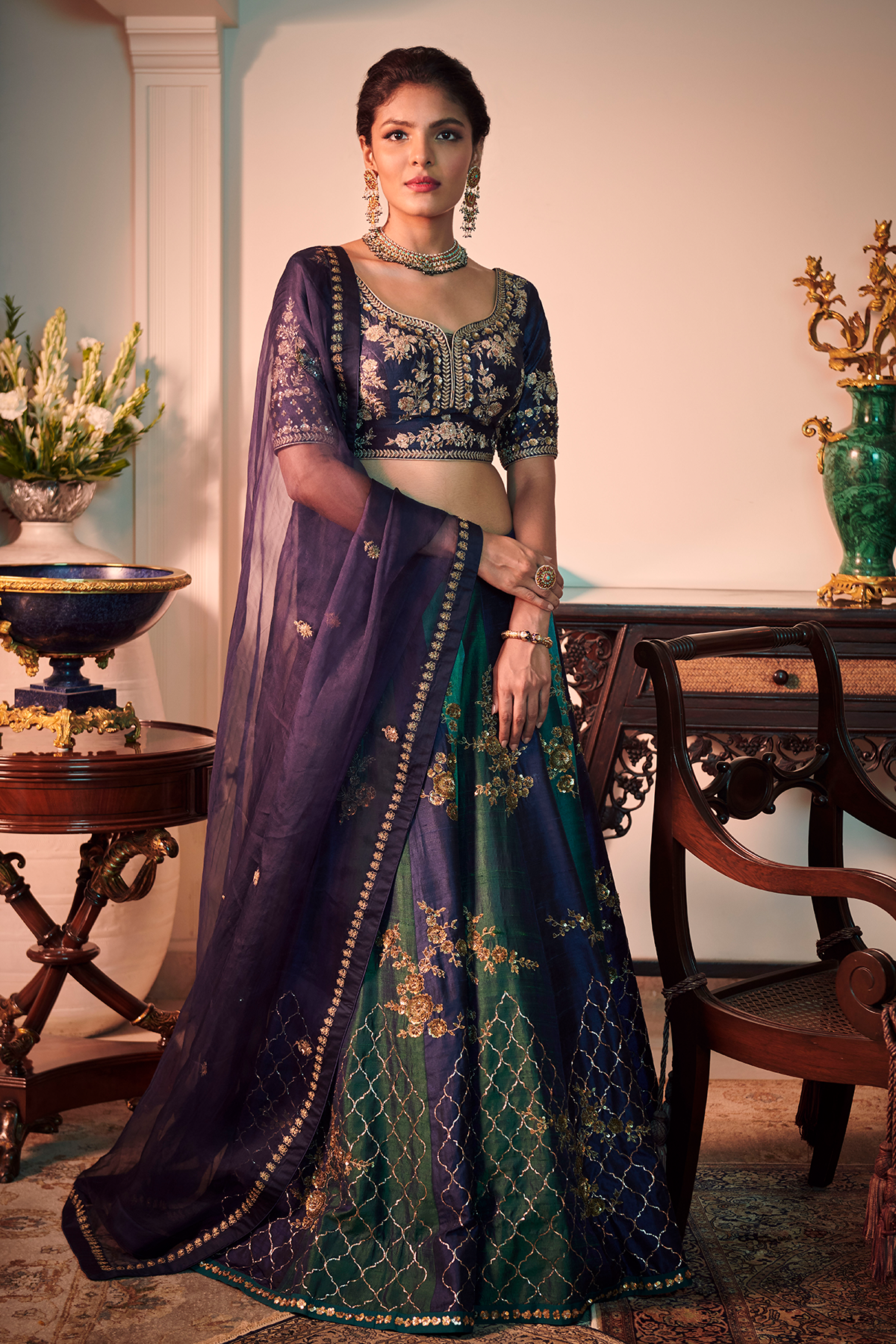 Multi-tone lehenga with golden sequins embroidery and pitta work. Paired with a blue raw silk blouse and organza dupatta.