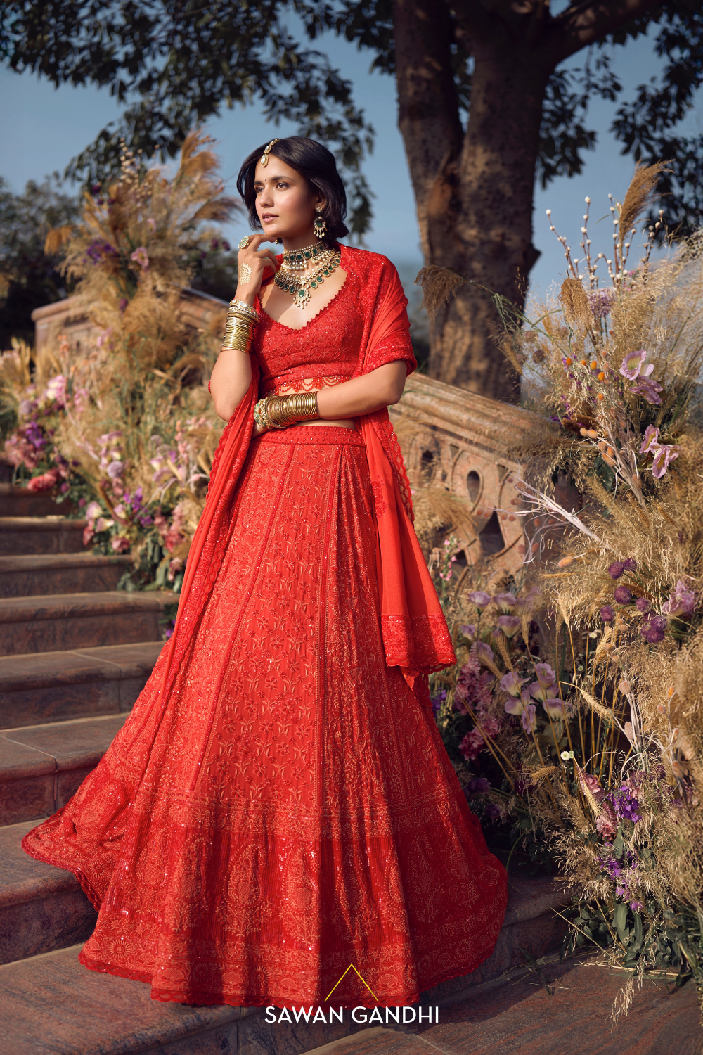Radiate elegance in our classic Orange-Red Chikankaari Lehenga adorned with cutdana and sequins embroidery. It is matched with beautifully tasseled chikankari blouse and a dupatta.