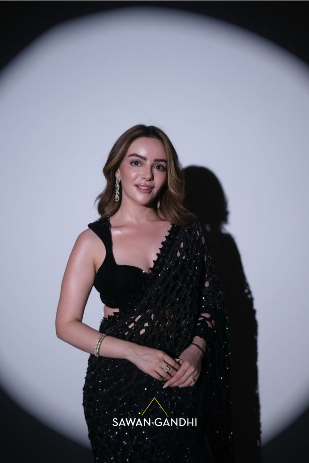 A black cutwork saree featuring a graceful transition from grey to black ombre sequins detailing, elegantly paired with a black velvet blouse and a petticoat.