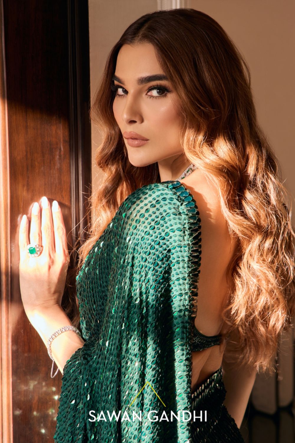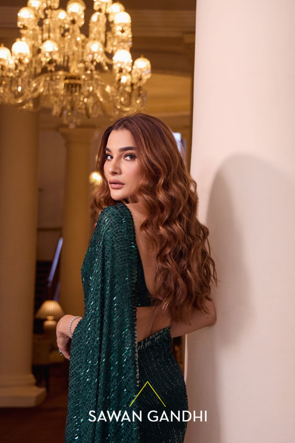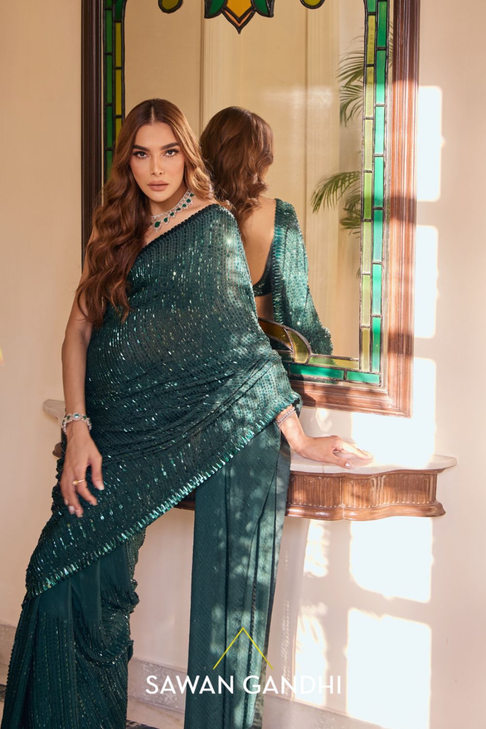 Bottle Green Kashti saree is hand embroidered with trims which are scattered all over the saree with a beautiful heavy work border across the saree.It is paired with a kashti work blouse and a petticoat.