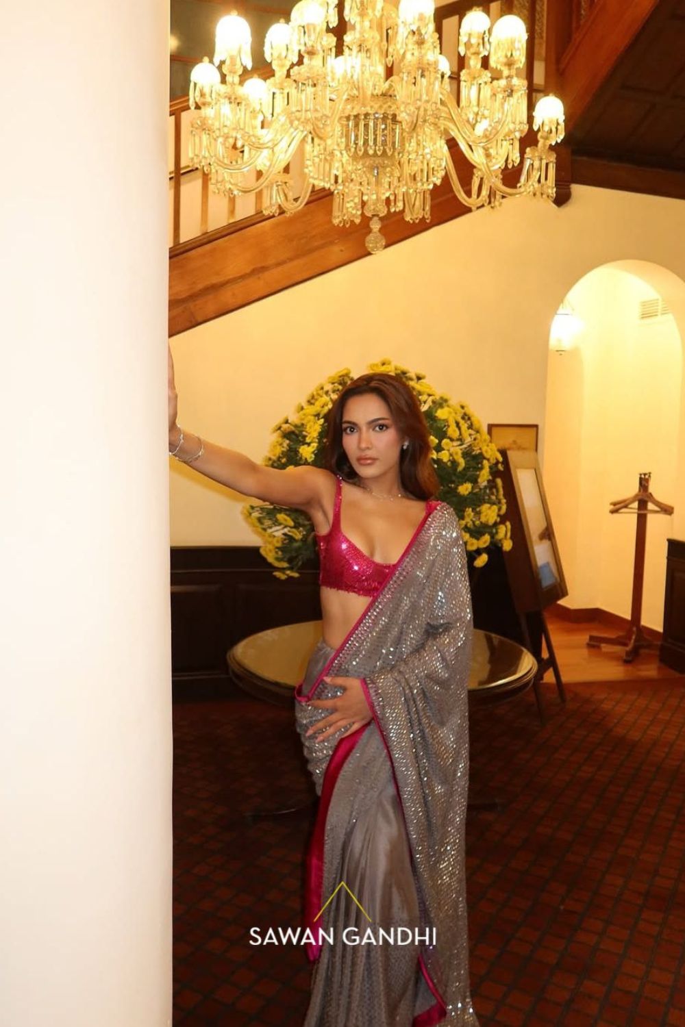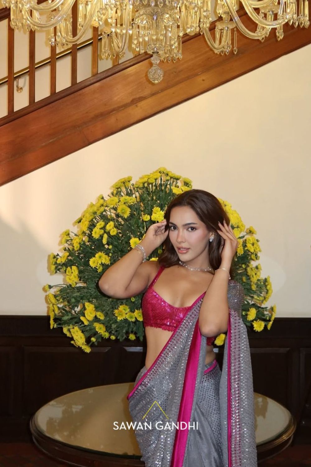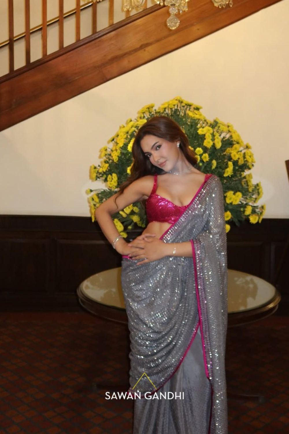 Grey Kashti saree is hand embroidered with trims which are scattered all over the saree with a beautiful heavy work border across the saree. The look is completed with hot pink kashti blouse giving it a perfect contrast.