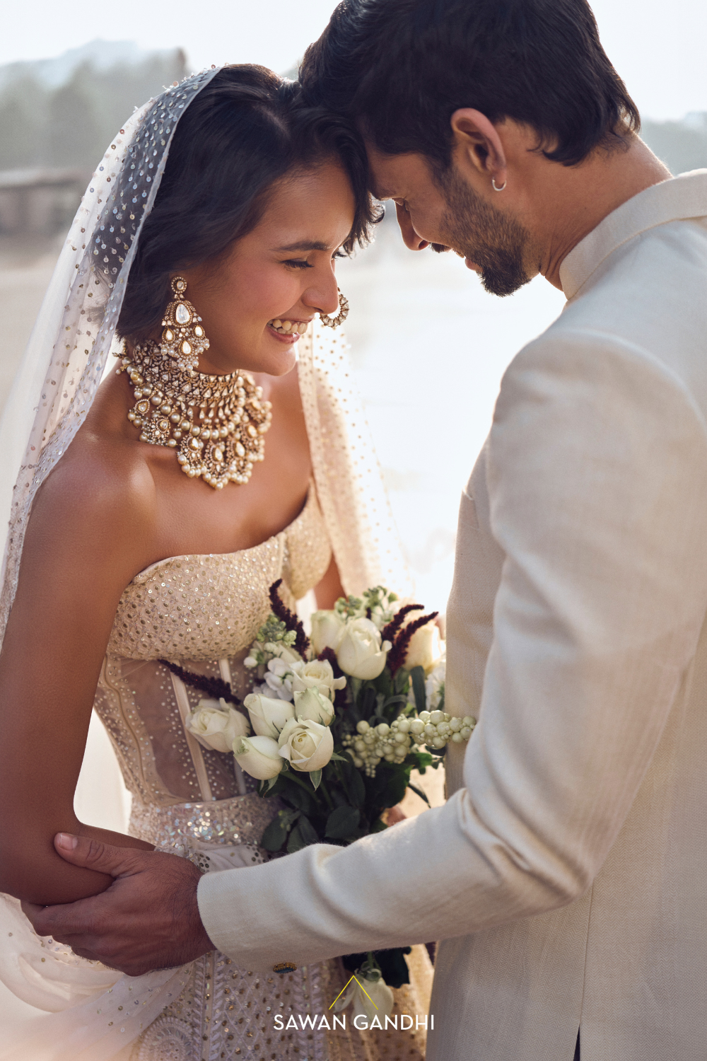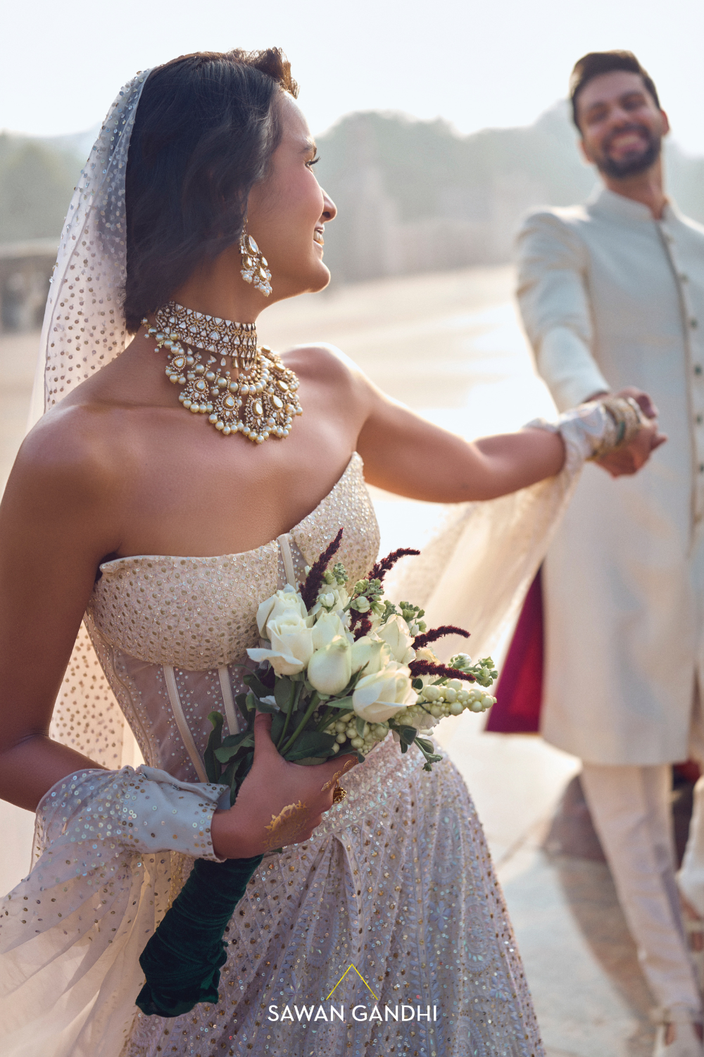 The timeless beauty- Pearl white Chikankari lehenga showcases the fineness of Lucknowi artisanship. The lehenga is paired with Swarovski  embellished corset and a sheer delicate dupatta