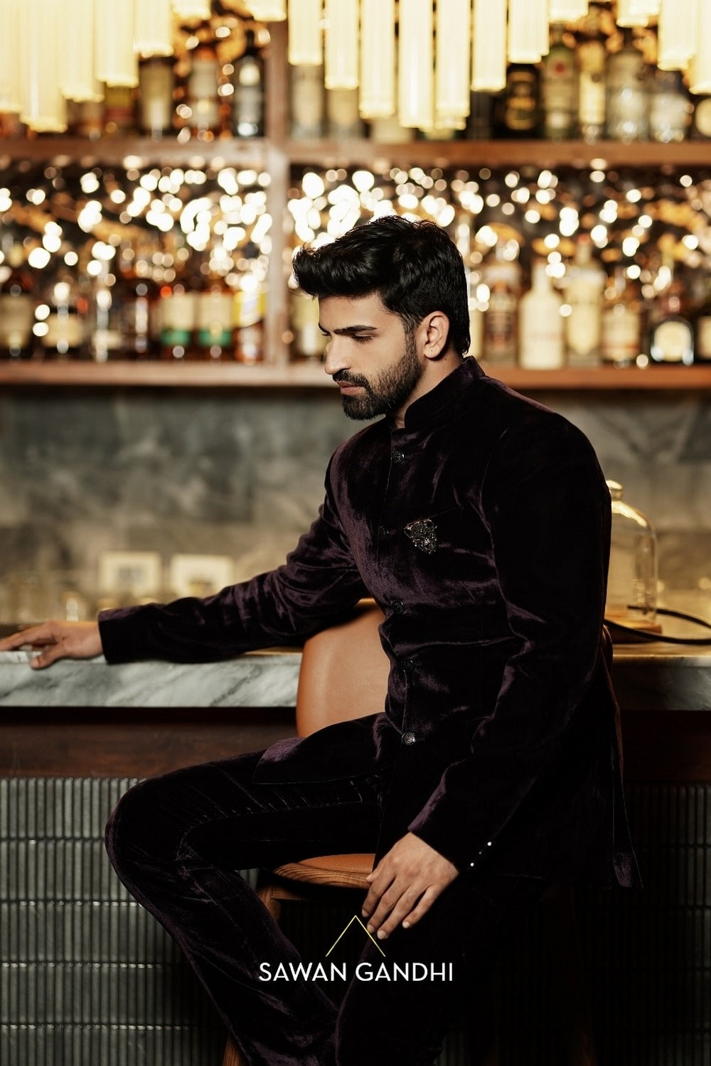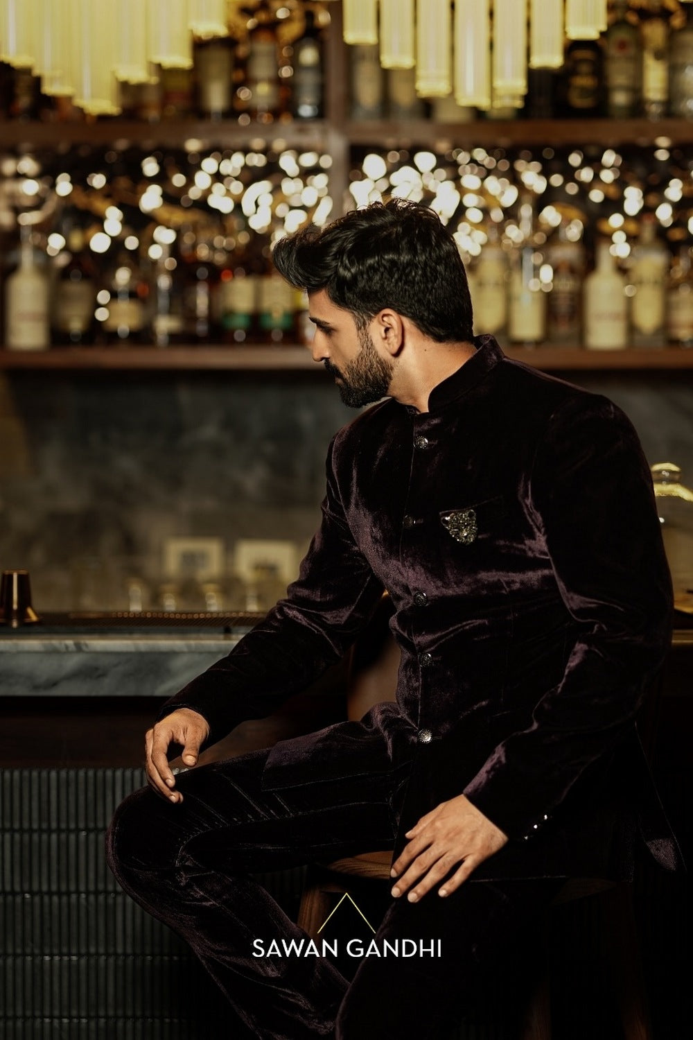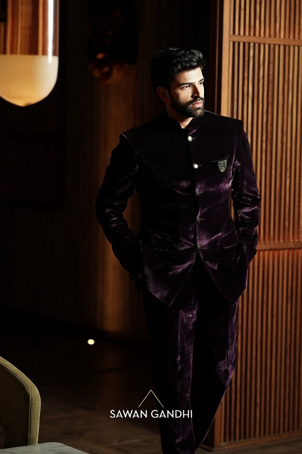 Wine velvet bandhgala with oxidised buttons . Paired with wine velvet pants .