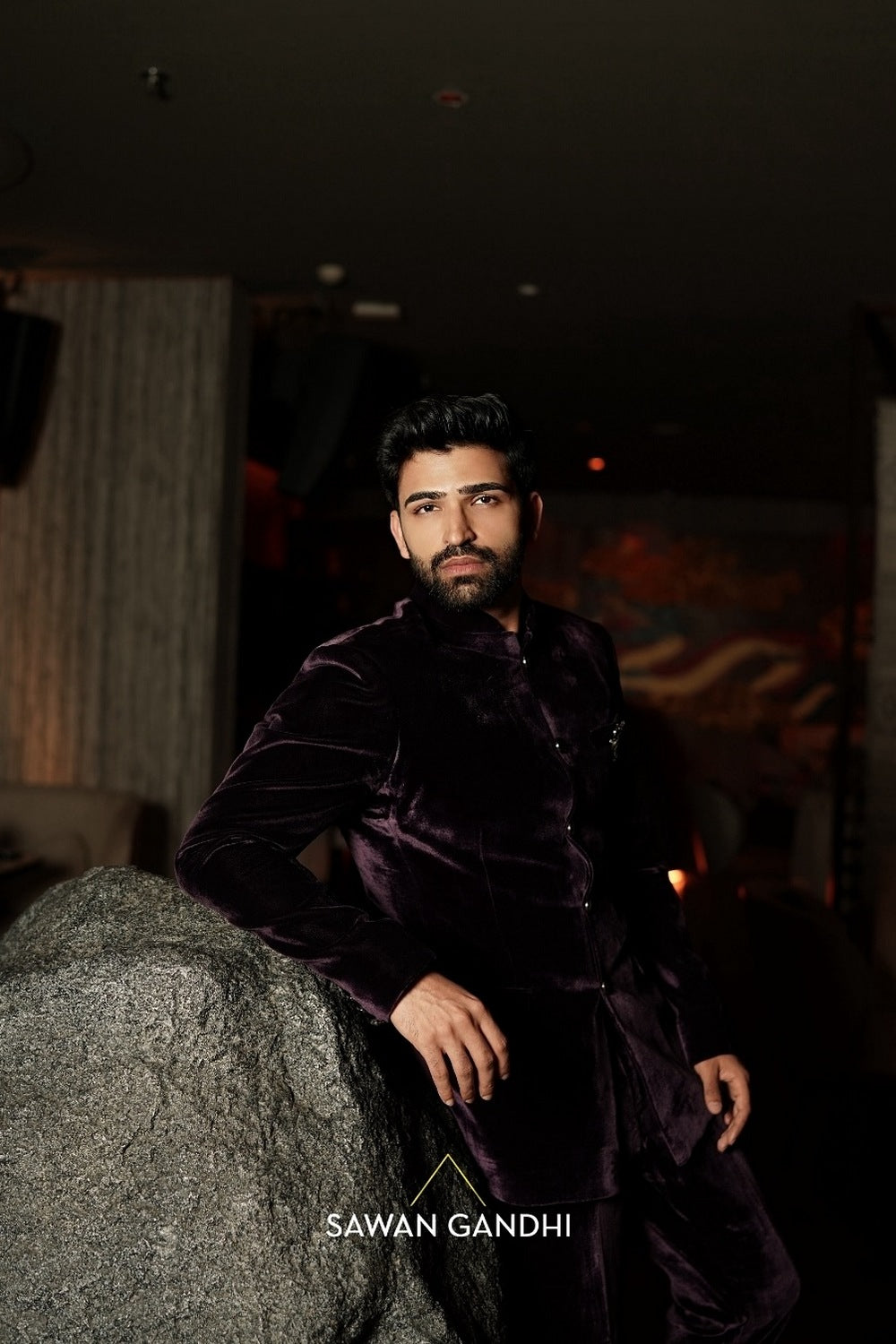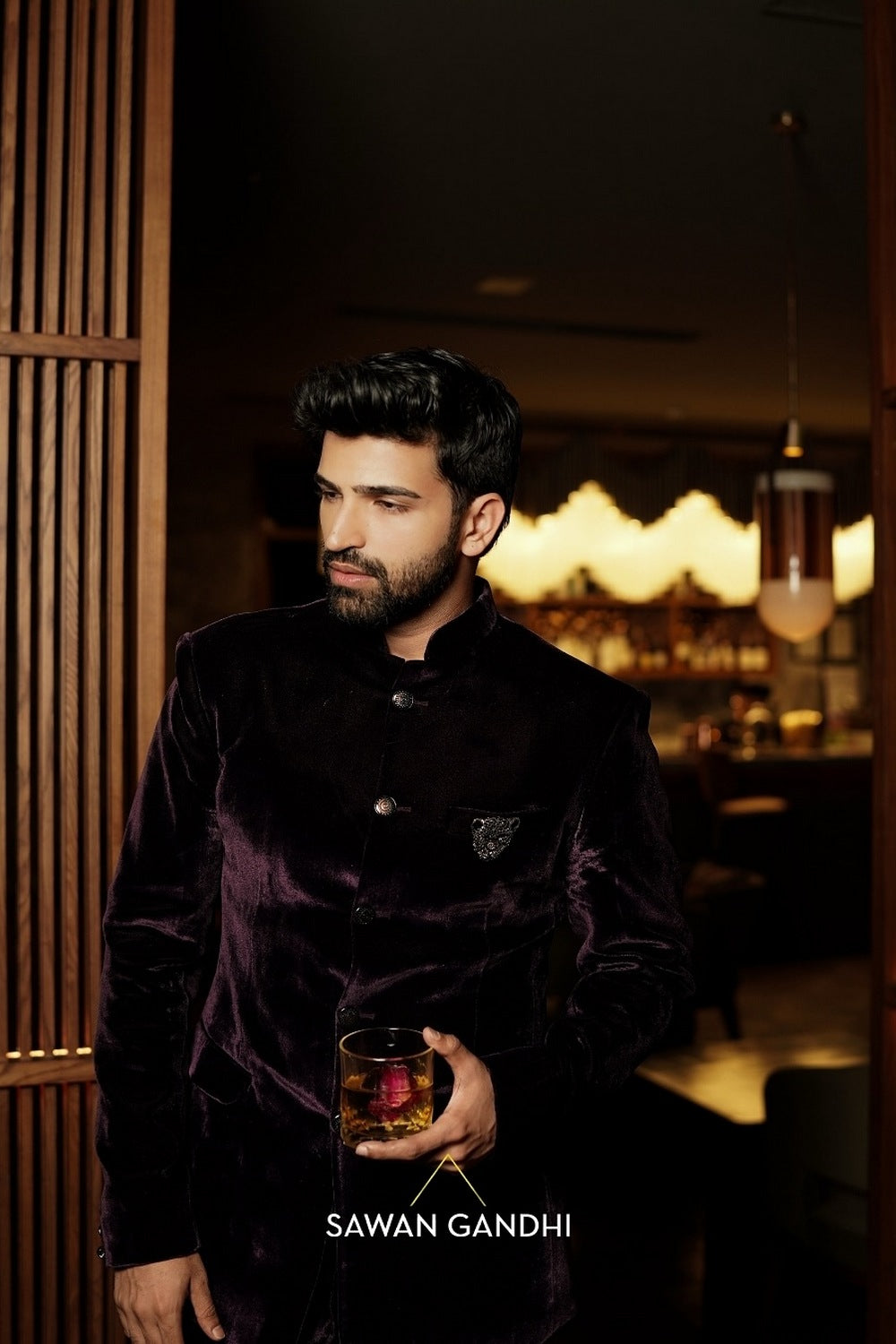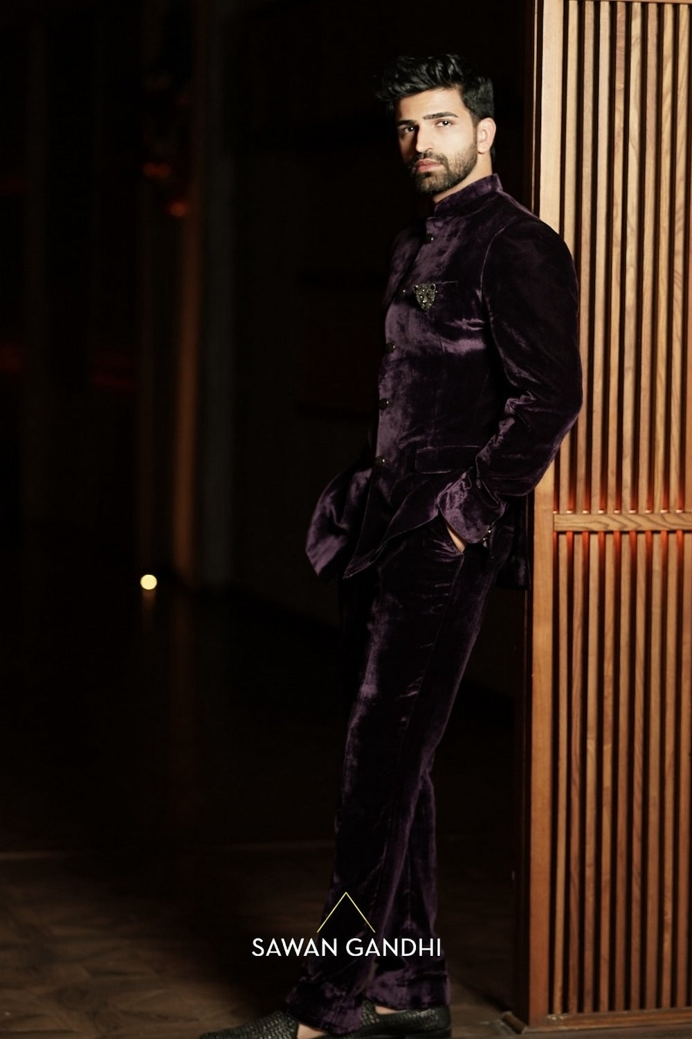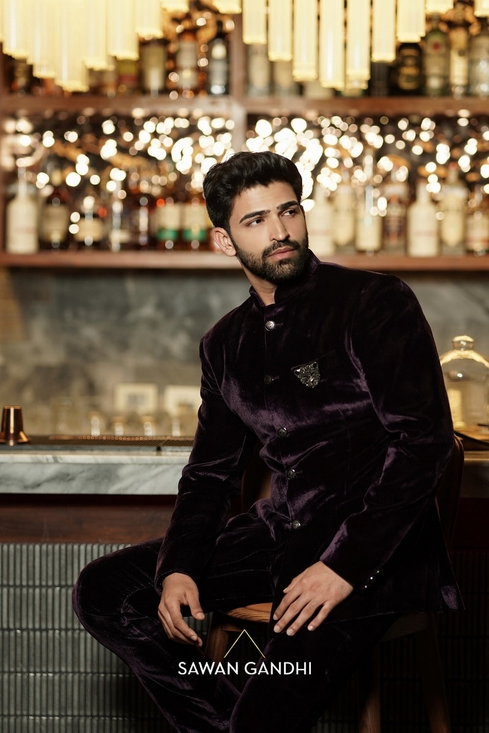 Wine velvet bandhgala with oxidised buttons . Paired with wine velvet pants .